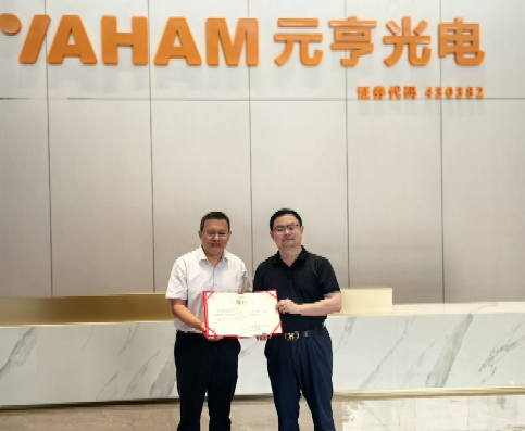 图:杨荣源副董事长代表公司向元亨光电朱海涛董事长颁发百年校庆捐赠物品的感谢状
