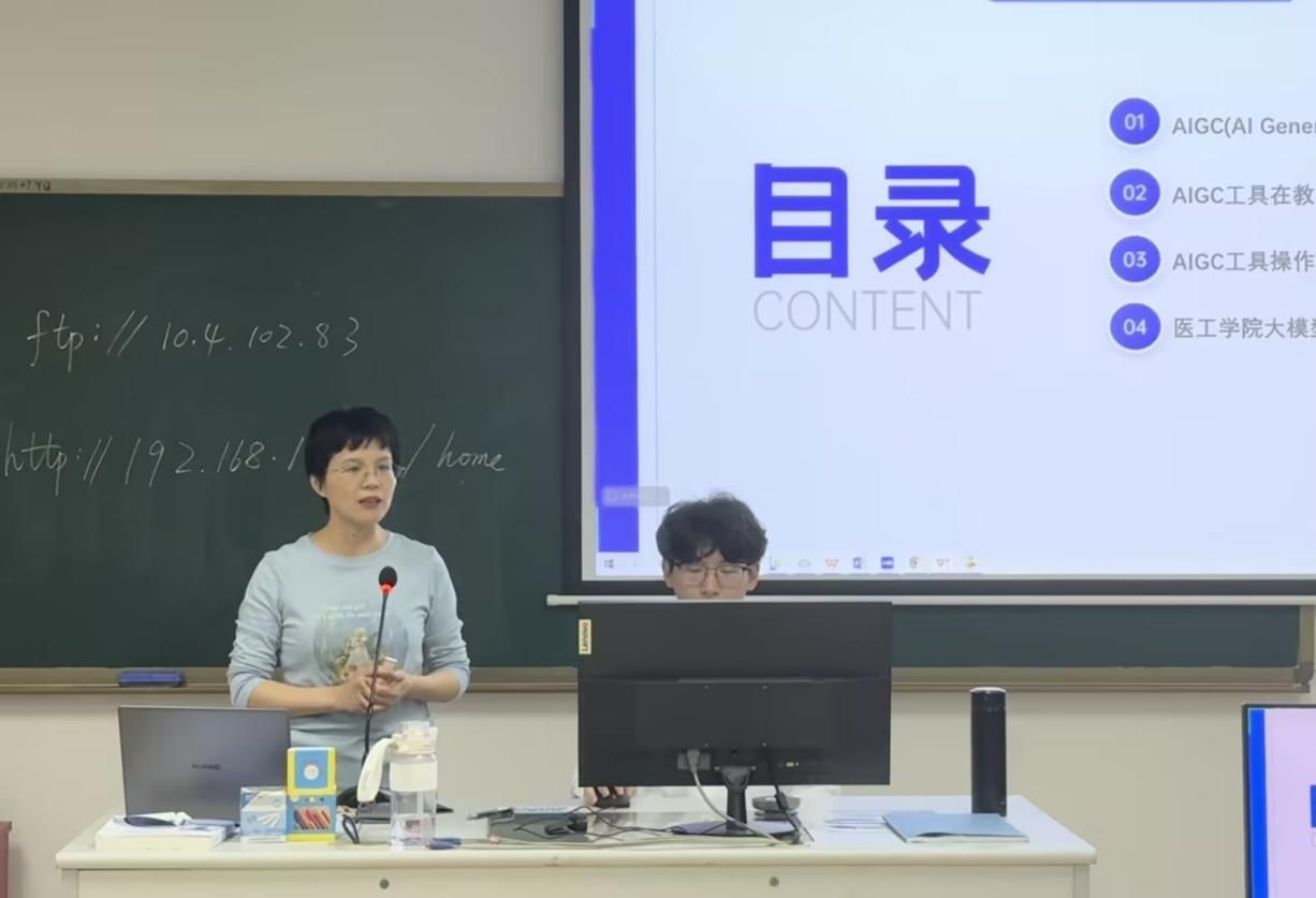 第二天的课程主题为“利用AI多模态能力赋能教学”,由陈平平副经理和谭定英老师主讲。陈平平副经理带领乐天使教学团队,围绕AIGC(AI Generated Content)展开讲解,内容涵盖AIGC工具在教学中的应用、操作演示以及医工公司大模型研究的最新进展。陈经理结合实际教学场景,展示了AI技术如何有效提升教学效率与质量。
