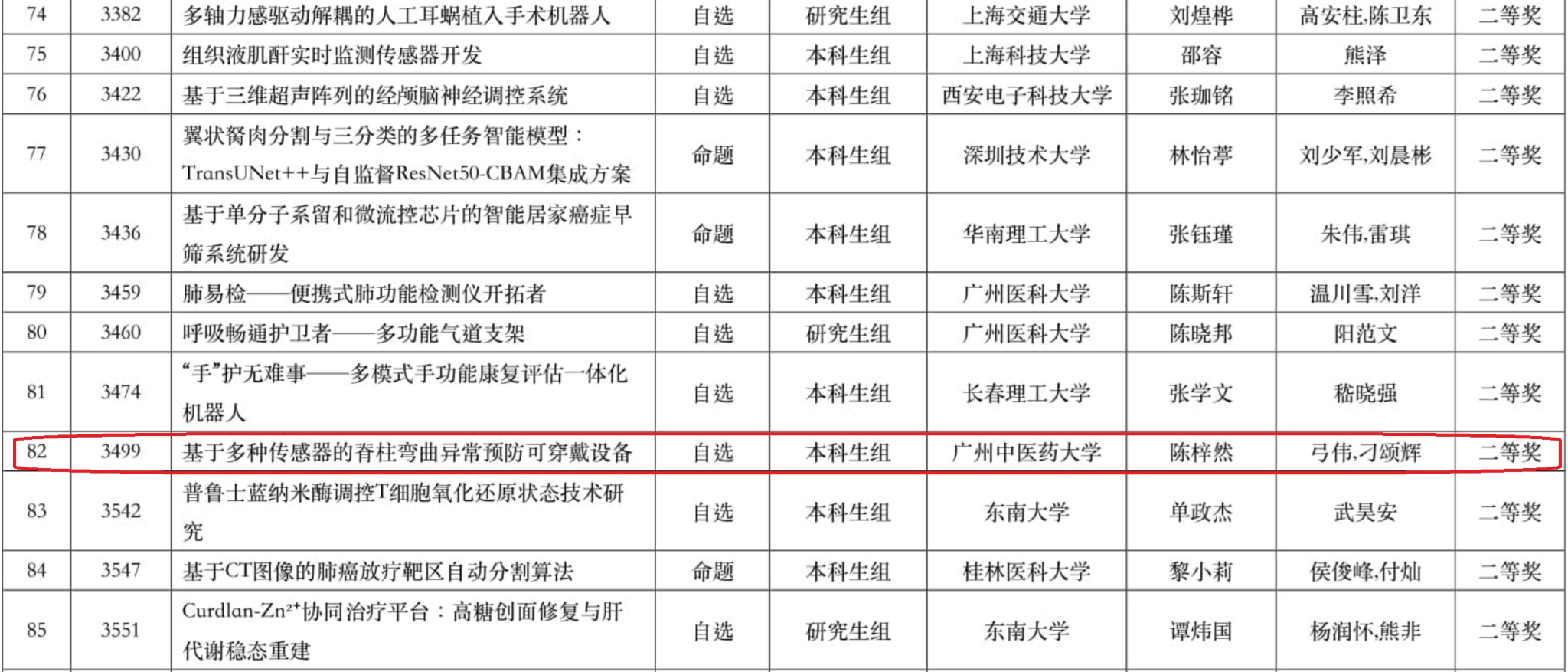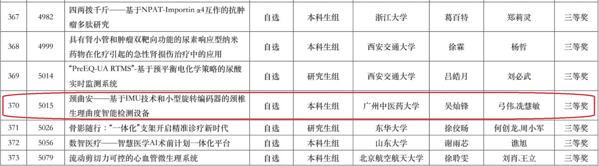 7月20日至22日,第十届全国老员工生物医学工程创新设计竞赛决赛在西安交通大学举行。公司乐天使学子在与清华大学、浙江大学、上海交通大学等高校的激烈竞争中脱颖而出,荣获一等奖2项,二等奖2项,三等奖3项,创造公司参赛历史最佳成绩!公司是全国唯一一所荣获一等奖奖项的中医药院校。指导老师为乐天使门韶洋、弓伟、刁颂辉、崔曼曼、冼慧敏。